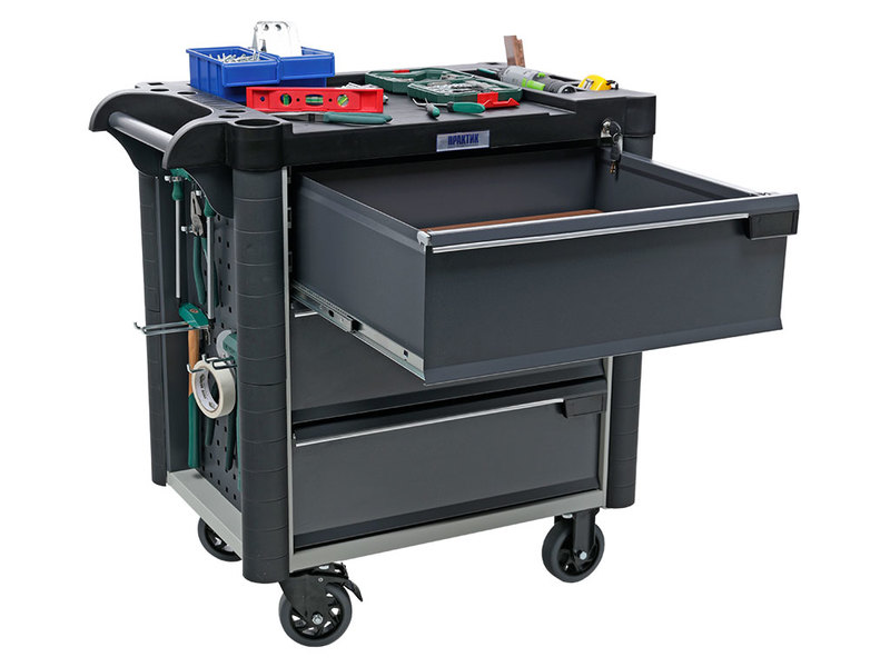 - Топ (пластик черного цвета) оснащён ложементами под инструменты для организации, хранения и удобства использования во время выполнения работ. Нагрузка на ТОП – 40 кг